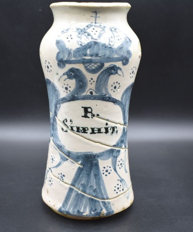 Durante la Edad Moderna, las farmacias de toda España eligieron como método de almacenaje de sus medicamentos estos elegantes recipientes cerámicos. Almazán también creó aquí su propio estilo elaborando botes, pastilleros y orzas con formas redondeadas y decoraciones en azul sobre blanco